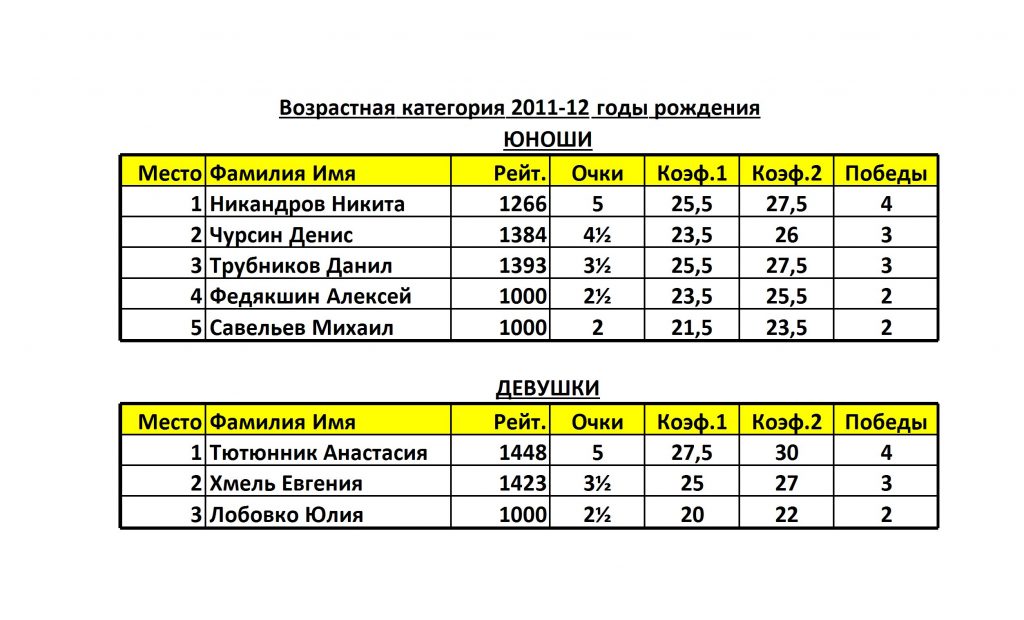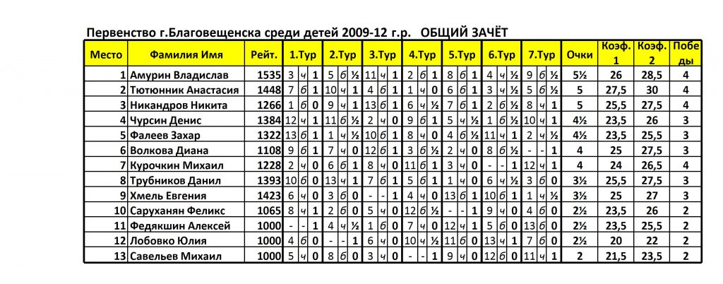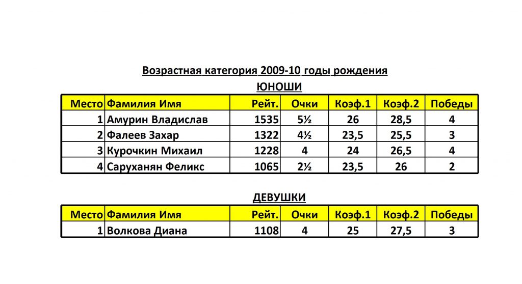 Напомню, что юные шахматисты обеих возрастных групп 2011-12 и 2009-10 годов рождения играли в одном турнире, но результаты зафиксированы отдельно – как по возрасту, так и между юношами и девушками. В группе 2011-12 годов рождения среди юношей лучшим стал Никандров Никита, набравший 5 очков, второе место – у Чурсина Дениса (4,5 очка), третье занял Трубников Данил (3,5 очка). Девушки этой возрастной категории пришли к финишу в следующем порядке: 1- Тютюнник Анастасия (5 очков), 2 – Хмель Евгения (3,5 очка), 3- Лобовко Юлия (2,5 очка). И, наконец, в возрастной группе 2009-10 годов рождения среди самых старших участников первенства у Волкова Дианы не было конкуренток, поэтому она единолично заняла первое место. Ну, а среди юношей на первое место вышел Амурин Владислав с 5,5 очками, Фалеев Захаров занял второе место с 4,5 очками и Курочкин Михаил пришёл финишу третьим — у него четыре очка.
