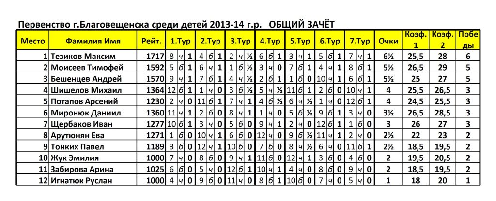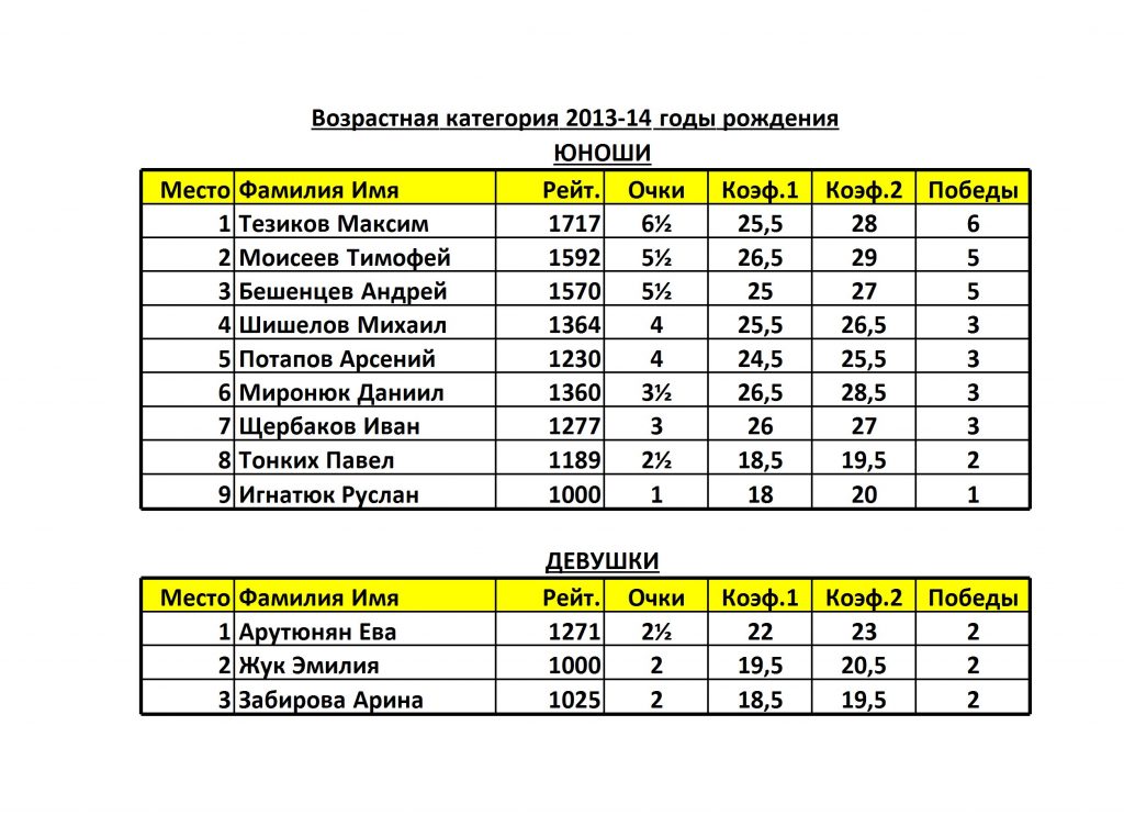 В возрастной группе 2013-14 годов рождения среди юношей первое место уверенно занял Тезиков Максим с 6,5 очками, второе место у Моисеева Тимофея с 5,5 очками, а на третье место вышел Бешенцев Андрей, набрав те же 5,5 очков, но его коэффициент оказался ниже. Среди девушек этой группы на первой строчке – Арутюнян Ева, вторая – Жук Эмилия, третья – Забирова Арина.