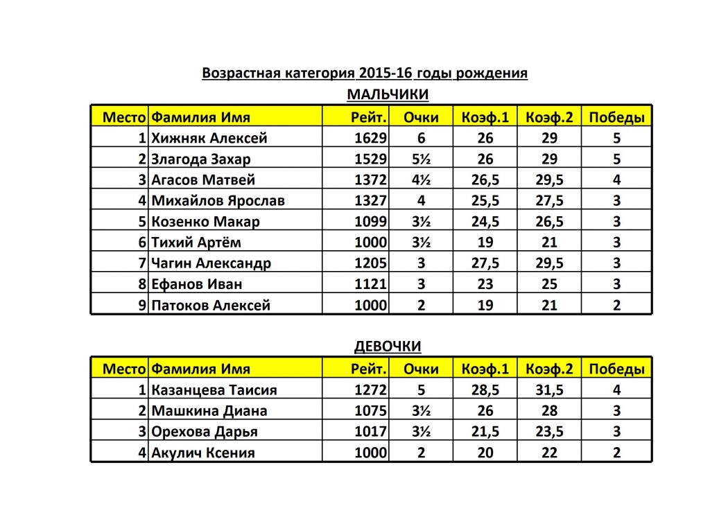 В группе ребят 2015-16 годов рождения первенствовал Чистяков Максим (6 очков), вторым пришёл к финишу Сидоров Степан (5,5 очков), а на третье место вышел Тарасов Данила с 5-ю очками.