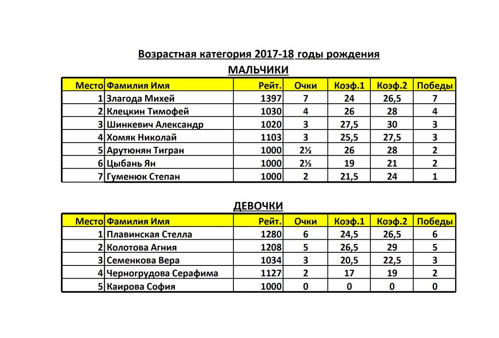 В группе мальчиков и девочек 2017-18 года среди мальчиков абсолютно лучший результат показал Злагода Михей, — он набрал семь очков из семи возможных, вторым к финишу пришёл Клёцкин Тимофей с четырьмя очками, а на третьем месте -Шинкевич Александр — у него три очка. Ровно столько же очков набрал Хомяк Николай, но уступил Александру по коэффициенту. А среди девочек этой группы на первое место вышла Плавинская Стелла с шестью очками, второй стала Колотова Агния — у неё пять очков и на третьем месте с тремя очками — Семенкова Вера. К сожалению, по болезни выбыла Черногрудова Серафима, которая могла составить реальную конкуренцию в борьбе за призовые места.
