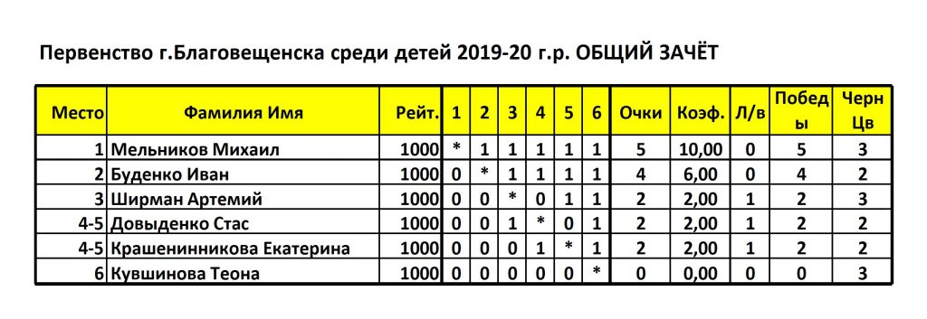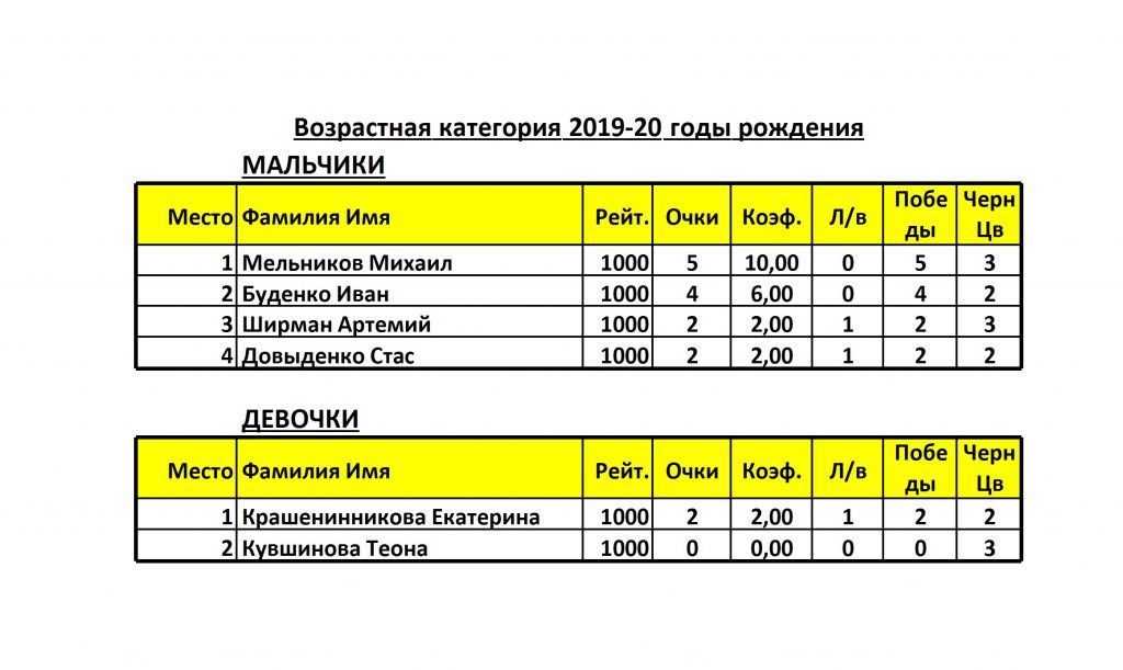 Спортивные результаты среди ребят 2019-20 годов рождения таковы: первое место завоевал Ширман Артемий — он набрал 4,5 очка из шести возможных. Ровно столько же набрала Крашенинникова Екатерина, причём она выиграла у лидера, однако коэффициент у неё оказался похуже. А третьим стал Мельников Михаил, который тоже набрал 4,5 очка, но его коэффициент был ещё слабее, чему Екатерины.